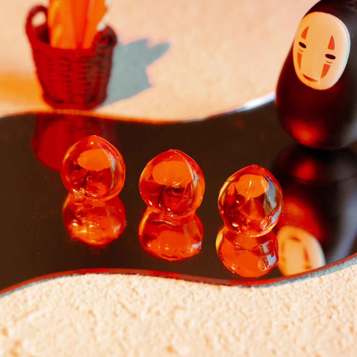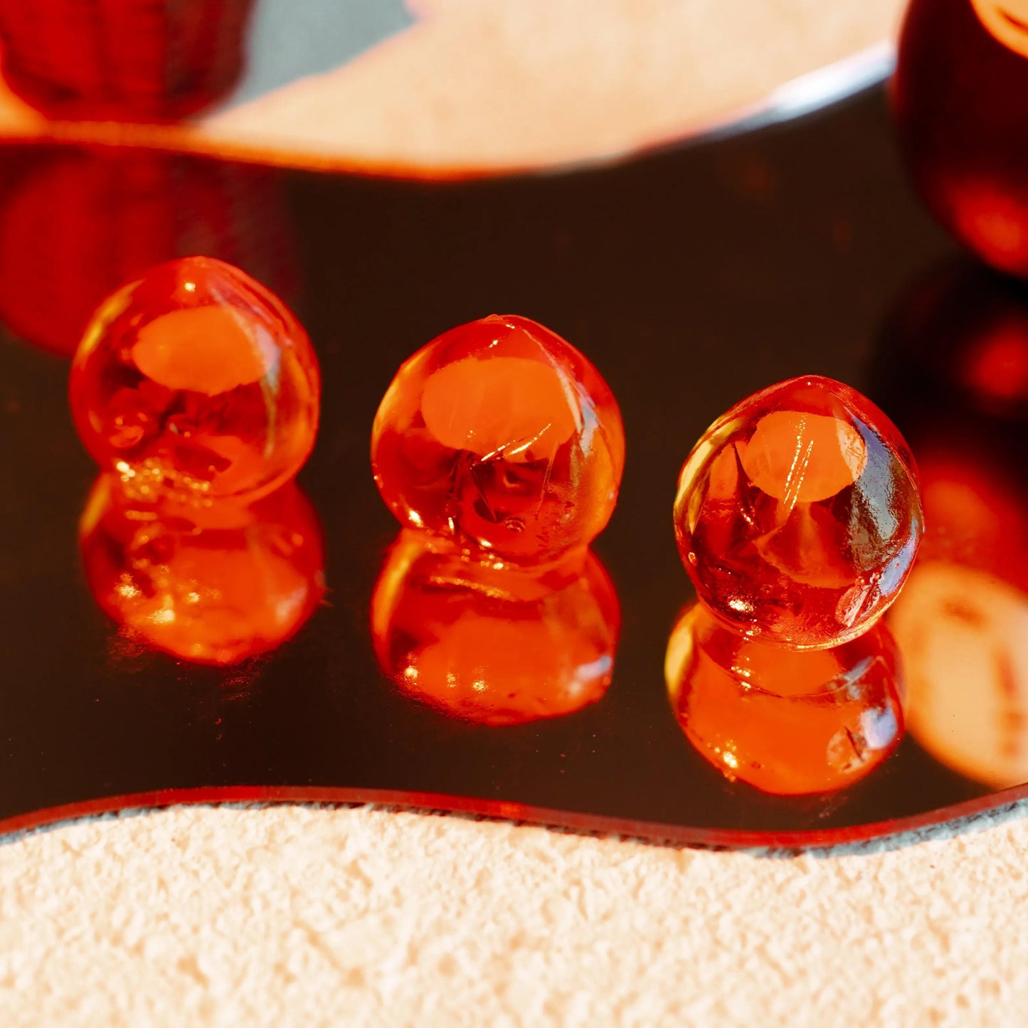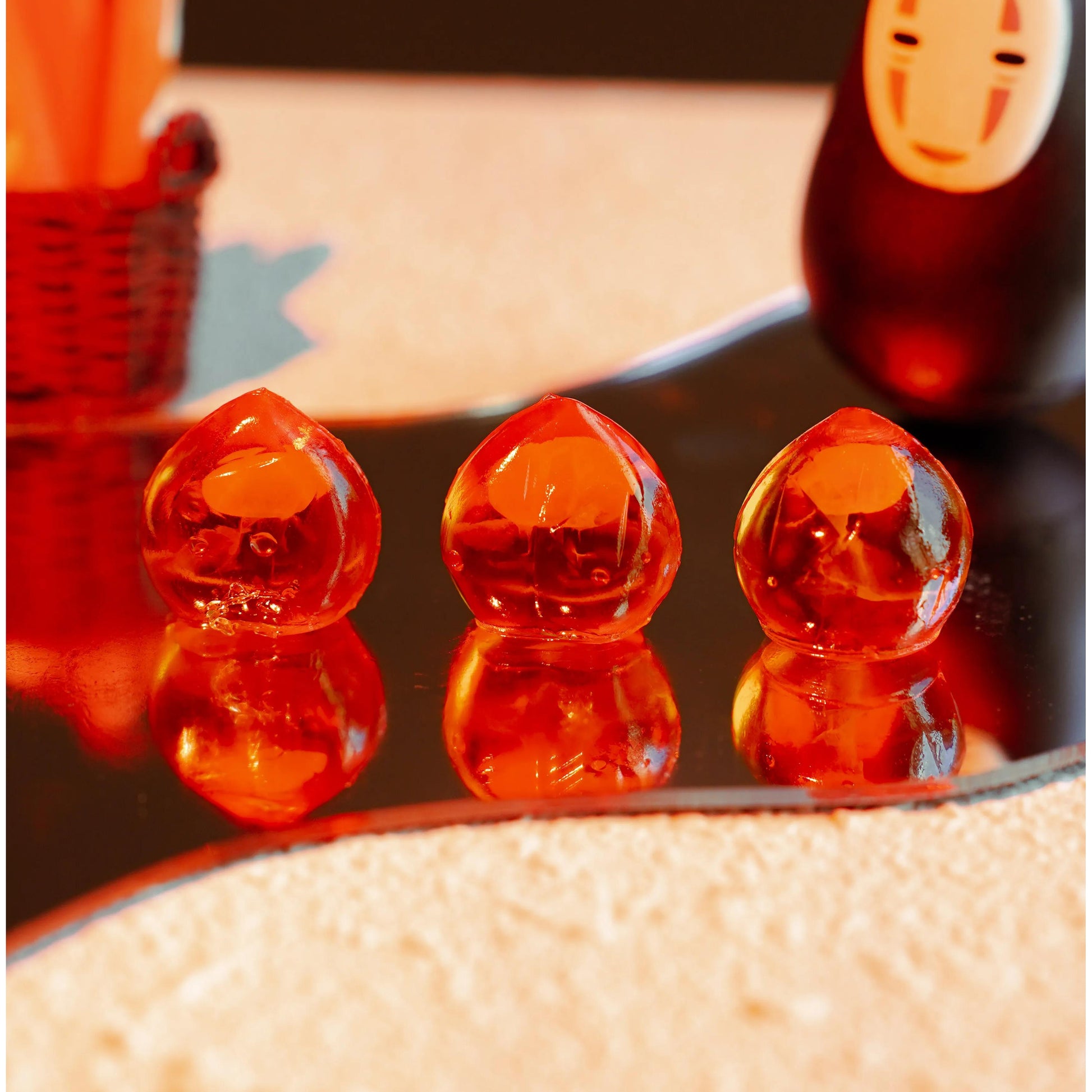 4D fruit juice-filled, bursting peach gummies, each one crystal clear and plump