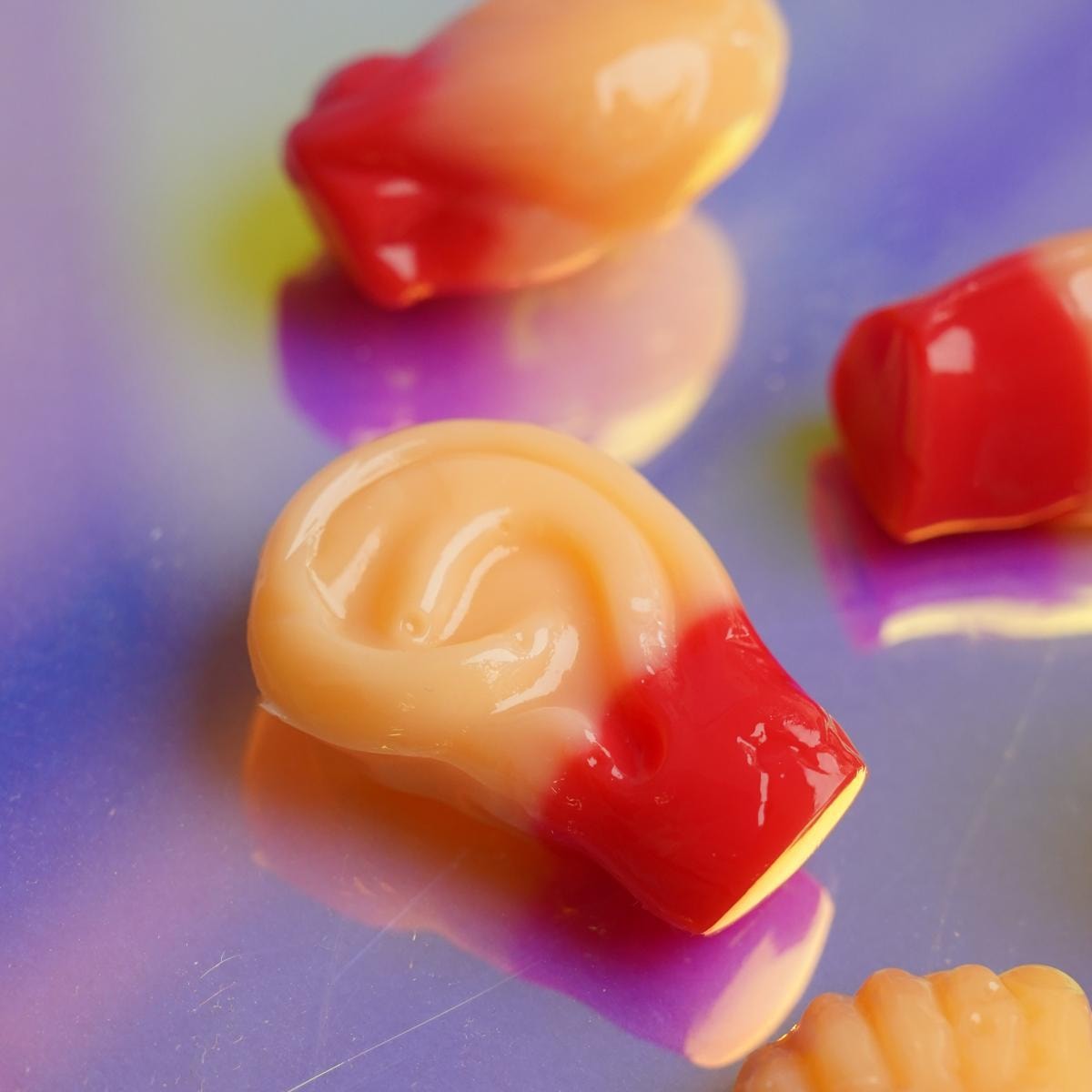 A combination of red cherry flavor and flesh-colored orange flavor body part candies,