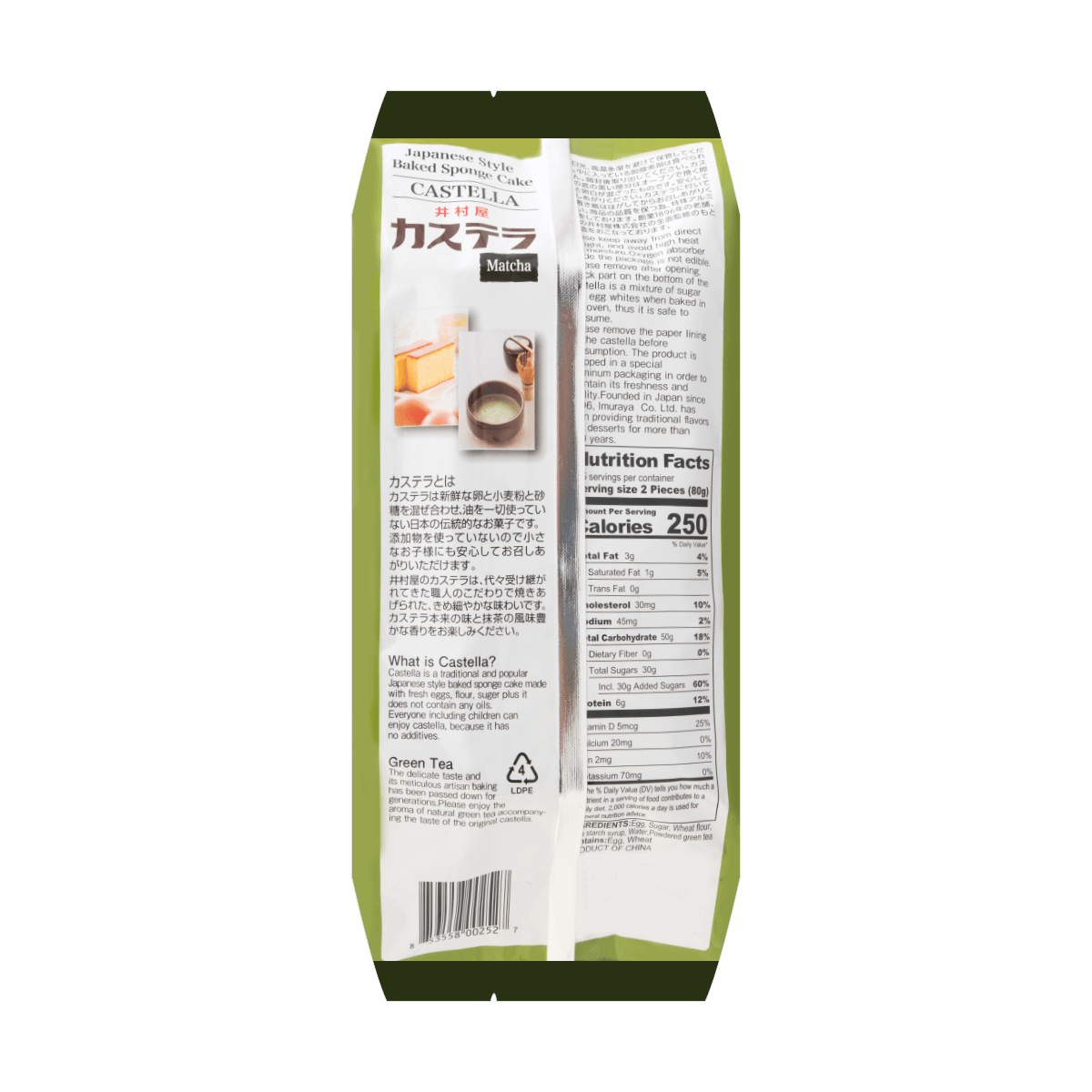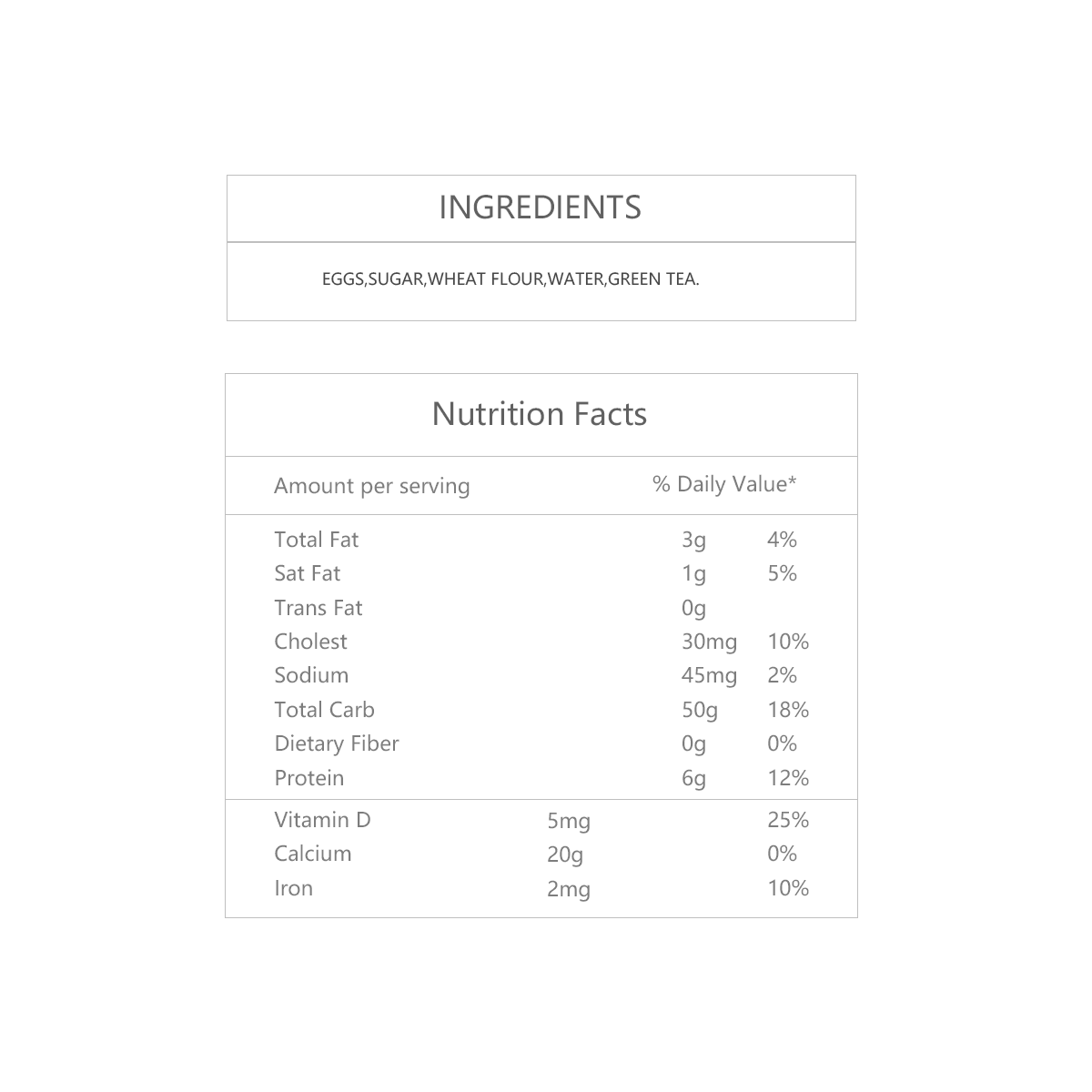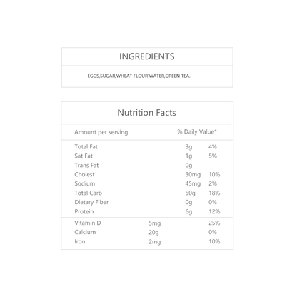 | Ingredients | Wheat flour, water, sugar, green tea, eggs. |