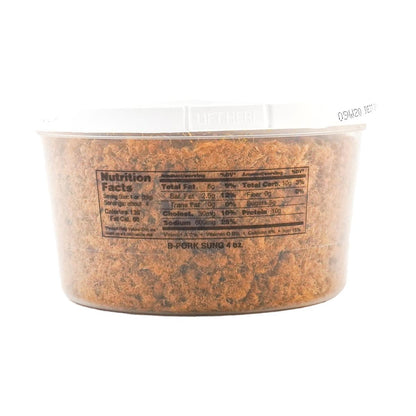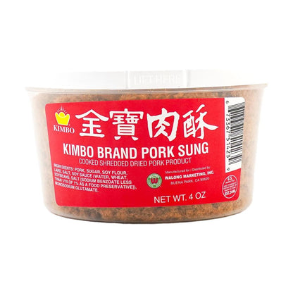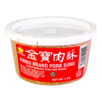 Kimbo Pork Sung Pork Floss, Rousong is dry, shredded pork. Typically, this pork floss, or pork fu is used for topping congee, garnishing for savory pastries, or as an addition to rice porridge